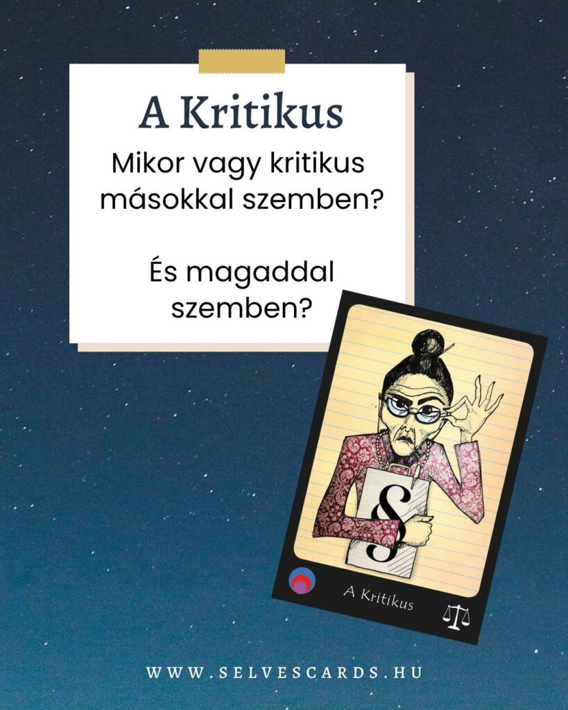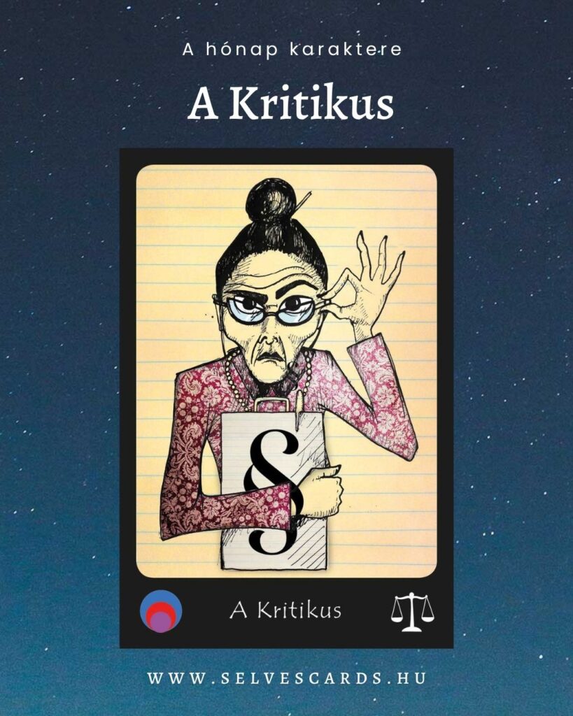 A Kritikus belső karaktere szerintem mindenki számára ismerős. Gyakran ő a belső csapatunk legerőteljesebb hangja, szigorú szemmel vizslatva minden tettünket, döntésünket, spontán impulzusunkat. Sokszor arra sarkall minket, hogy másokban kritizáljuk azt, ami valójában önmagunkban zavar – csakhogy mindez legtöbbször tudattalanul zajlik, és aktív önreflexiót igényel, hogy rálássunk erre a mintára.